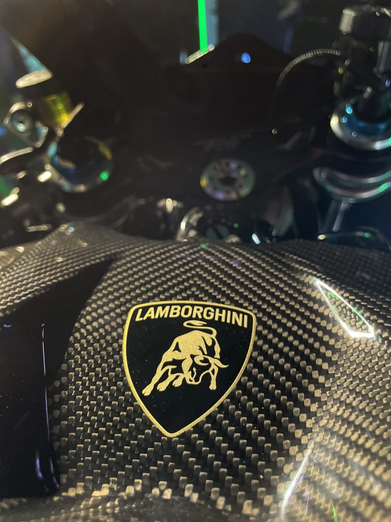 - Materiales: uso extensivo de fibra de carbono con tejido Twill expuesto, replicando la textura visual y la ligereza característica de los superdeportivos de Lamborghini.
