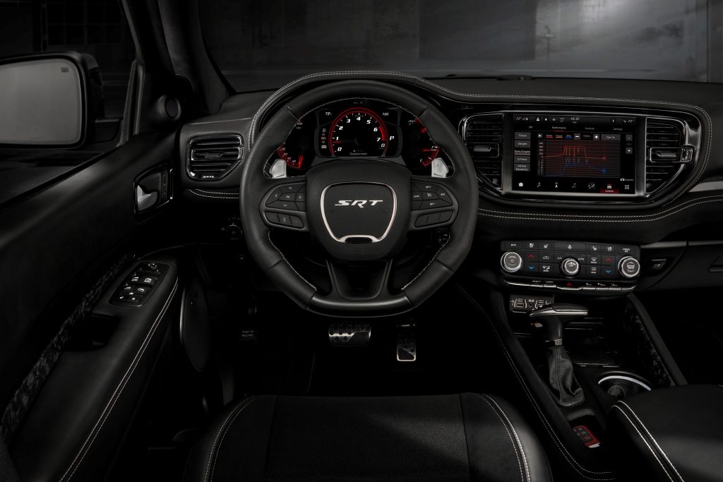 Otras de sus cifras nos hablan del poder que habita en esta versión de Durango. El supercargador desplaza 2.5 litros, con una presión de 11.6 libras, y la transmisión es una automática con 8 cambios que aplica el poder a las cuatro ruedas vía un sistema de tracción integral permanente. La velocidad tope está gobernada a 290 kilómetros por hora, con la capacidad de recorrer el cuarto de milla en 11.5 segundos.