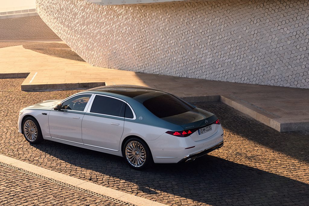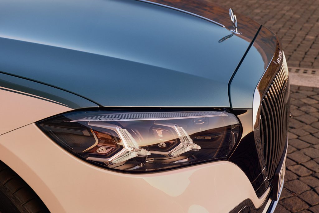 La nueva parrilla es un 20% más grande, cuya iluminación envolvente hace juego con los emblemas Maybach del pilar C y de los faros estrella, los cuales están acentuados con detalles en oro rosa. La identidad Mercedes está presente tanto al frente como en los centros de rin, los cuales cuentan ahora con emblemas montados en balero, permaneciendo siempre verticales: un tratamiento de marca característico previamente visto en Rolls-Royce, con opciones en 20 ó 21 pulgadas, éste último con acabado dorado.