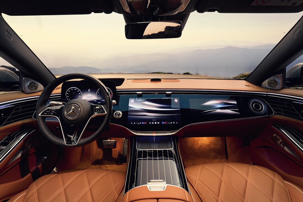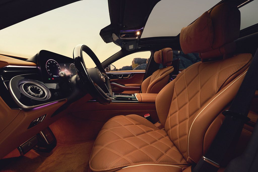 El interior se orienta a la comodidad y autoridad sin ostentación adicional. Acentos en madera de nogal de poro abierto se complementa de opciones en piel auténtica o, por primera vez en la marca, opción del material sintético ARTICO. Las plazas delanteras tienen al frente la Superpantalla MBUX de lado a lado, con botones envueltos por brillo en tono oro rosa. Los monitores de 36 y 31 pulgadas para conductor y copiloto están integrados bajo un solo cristal, del cual emerge el tablero de instrumentos.