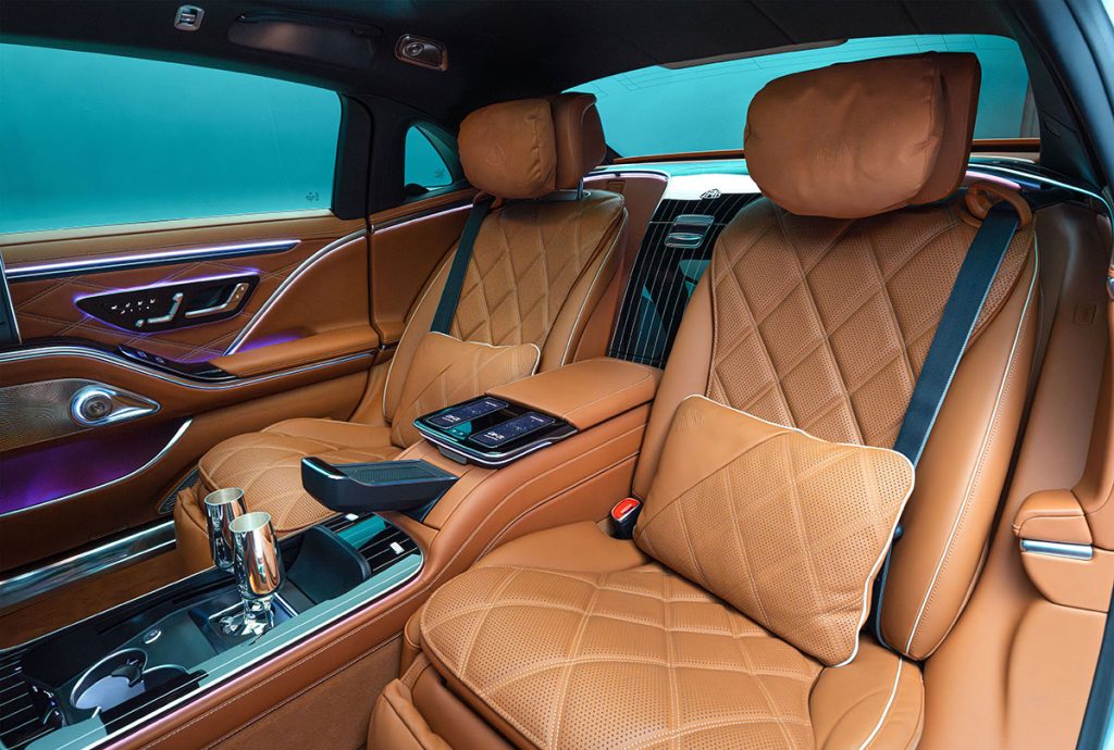 El acceso a las plazas posteriores es a través de puertas de cortesía con apertura y cierre automatizados, al toque de un botón. El enfriador de champaña se complementa con un juego de copas Robbe & Berking ornamentado por acentos de plata. Para quienes prefieren el volumen para llevar objetos personales, el enfriador es removible. La iluminación interior se basa en 199 leds, los cuales ofrecen 10 matices preseleccionados o 64 tonos al gusto, y su control es por comandos de voz. La comunicación, climatización y entretenimiento en plazas traseras es ofrecido a través de dos pantallas de 31 pulgadas, las cuales integran cámaras para tener videoconfererencia en movimiento.